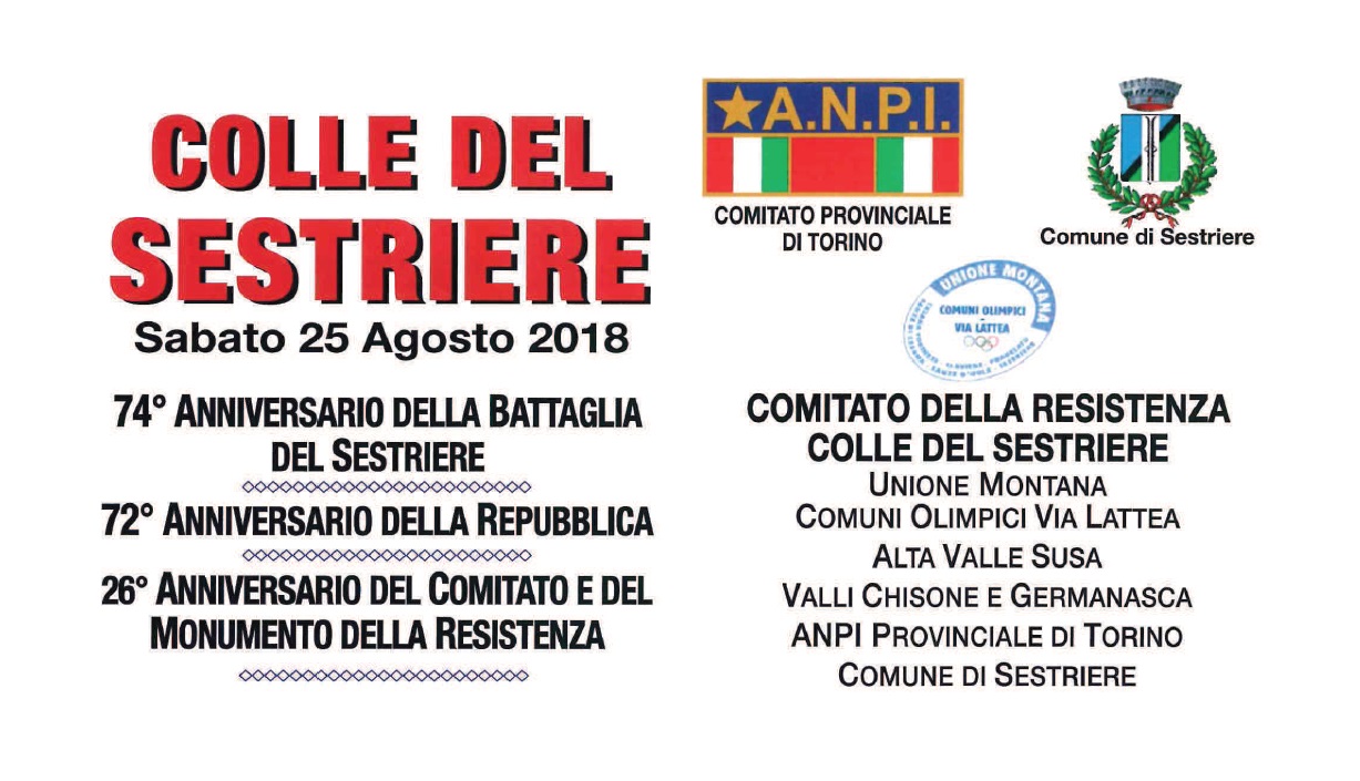Sabato 25 agosto 2018 il Comitato della Resistenza Colle del Sestriere, le Unioni Montane Comuni Olimpici Via Lattea, Alta Val di Susa, Val Chisone e Val Germanasca, l’Associazione Nazionale Partigiani d’Italia sezione Provinciale di Torino, ed il Comune di Sestriere organizzano un incontro al Colle del Sestriere in occasione del 74° anniversario della Battaglia del Sestriere e del 72° anniversario della Repubblica e del 26° anniversario del Comitato e del Monumento alla Resistenza. La manifestazione si svolge con il patrocinio richiesto del Consiglio Regionale del Piemonte, del Comitato della Regione Piemonte per l’affermazione dei valori della Resistenza e dei principi della Costituzione Repubblicana, della Città Metropolitana di Torino e dell’ANPI Nazionale.