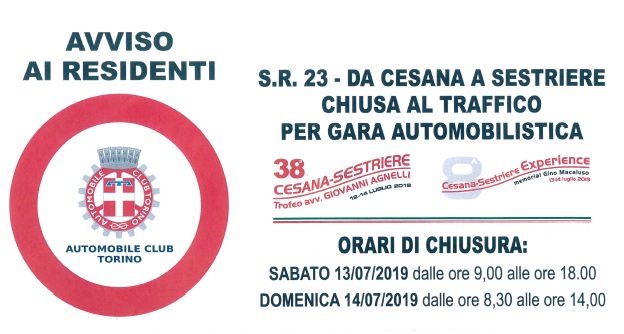Sabato 13 e domenica 14 luglio, per lo svolgimento della competizione automobilistica Cesana-Sestriere, è prevista la sospensione temporanea della circolazione veicolare e pedonale lungo la Strada Regionale 23 “Colle del Sestriere” dal km.103.500 al Km 92.00 nel tratto tra Cesana e Sestriere.