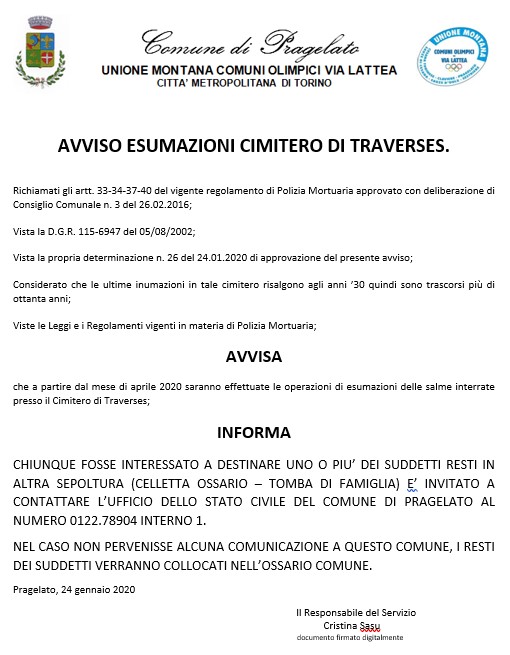 AVVISO PUBBLICO ESUMAZIONI CIMITERO TRAVERSES
