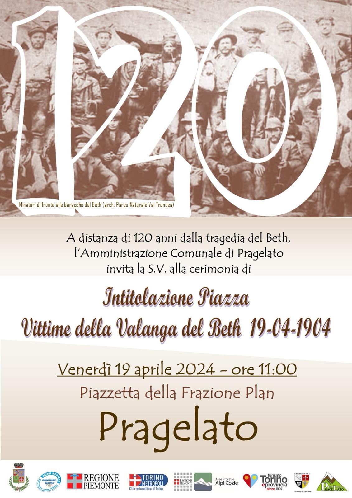Si da avviso che il giorno venerdì 19 aprile 2024 alle ore 11,00, presso la Piazzetta della Frazione Plan, si terrà la cerimonia di intitolazione della Piazza in Memoria delle Vittime della Tragedia del Beth, verificatasi in data 19/04/1904.