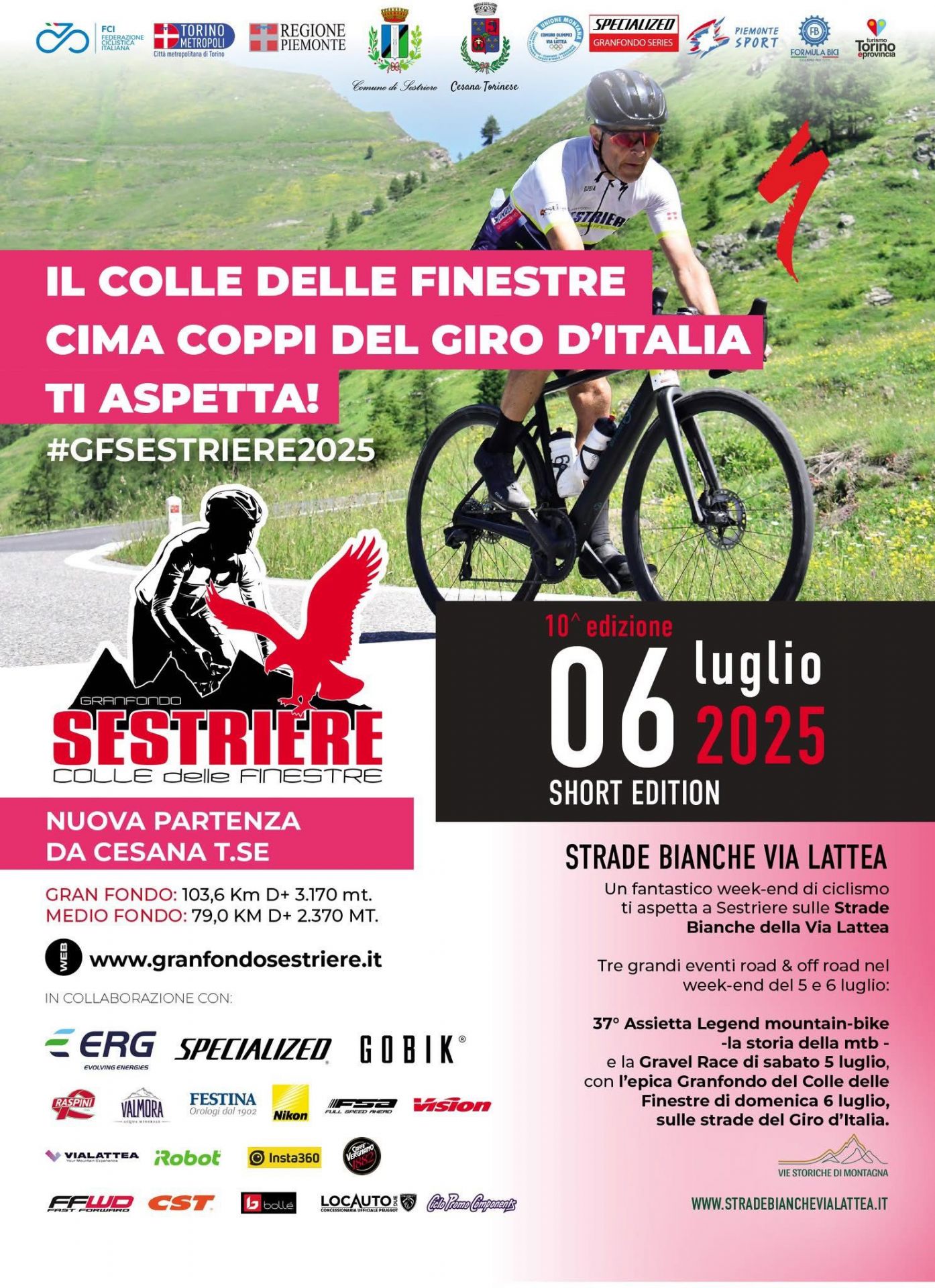 Corsa ciclistica da strada con nuova location di partenza da Cesana Torinese, arrivo a Meana di Susa e salita al Colle delle Finestre, discesa a Pourrieres, passaggio a Pragelato e arrivo a Sestriere. Due percorsi che toccano le nostre montagne: la gran fondo e la medio fondo.