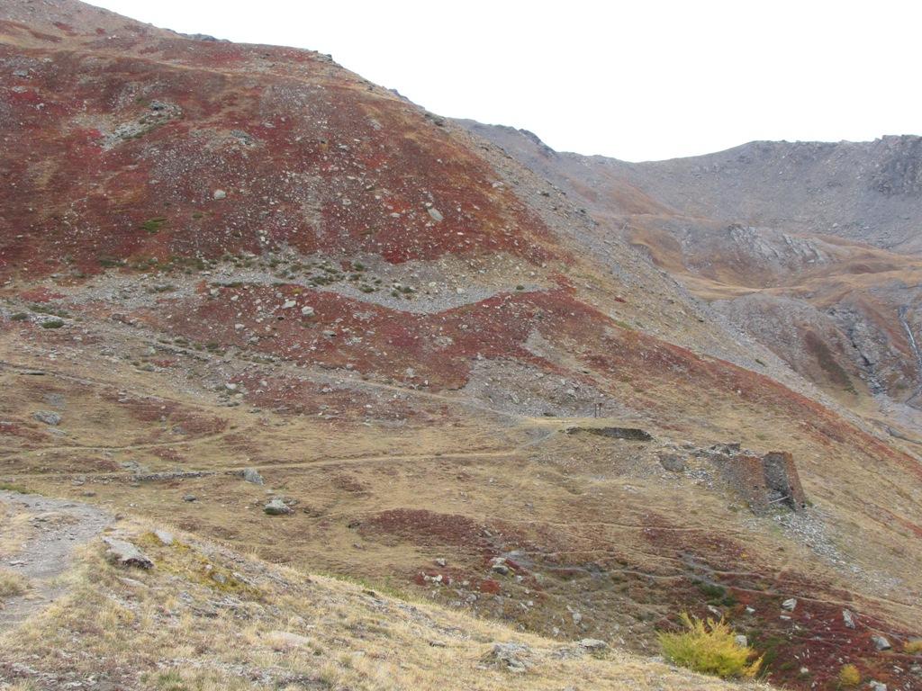 Si inerpica fino alla borgata e da qui in piano e lieve discesa si prosegue verso Troncea, nei pressi della quale ci si congiunge con il sentiero che da Troncea sale al Colle del Beth, larga e bella mulattiera, un tempo utilizzata anche dai minatori che lavoravano alle miniere del Beth; in località Forni di S. Martino (quota 2320 m) si trova il bivio dove si svolta a sinistra per il Colle Arcano; dopo poche decine di metri un basso cartello indica “sentiero degli alpini, colle arcano”, a destra; si sale nel mezzo del valloncello, seguendo le marche bianche e rosse (su pietre o su corti paletti infissi nel terreno), la esile traccia inizia poi a salire leggermente sulla destra e in breve arriva al Colle Arcano, sulla sinistra del Bric di Mezzogiorno.