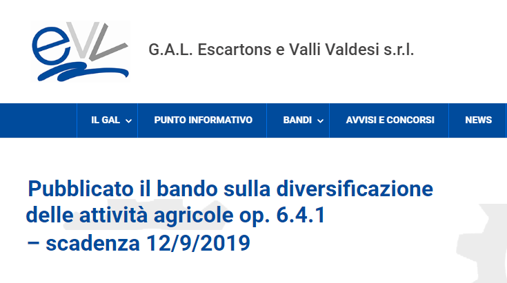 ll GAL Escartons e Valli Valdesi srl ha pubblicato il bando pubblico 6.4.1 , Misura 6 – Sottomisura 4 – Operazione 1 “Creazione e sviluppo di attività extra-agricole” prot. 72, con scadenza il 12/09/2019 ore 12,00. Tutte le info al link sotto indicato.